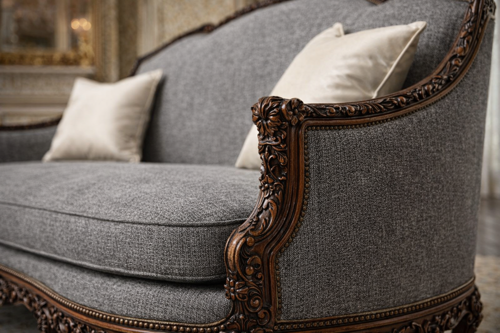 Upholstered in premium grey fabric, this sofa offers a sophisticated and versatile look that complements both classic and contemporary luxury interiors. The smooth cushioned seating ensures exceptional comfort, making it perfect for formal living rooms, drawing rooms, and elegant home settings.
