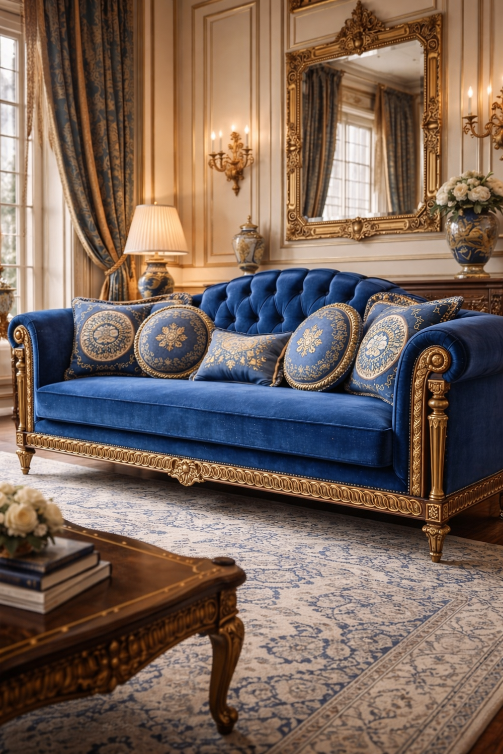 Bring palace-style luxury into your living space with the Imperial Azure – Royal Blue Gold Carved 3 Seater Sofa. Designed to stand out, this sofa features a rich royal blue upholstery paired with a handcrafted antique gold carved wooden frame, creating a bold and elegant statement.