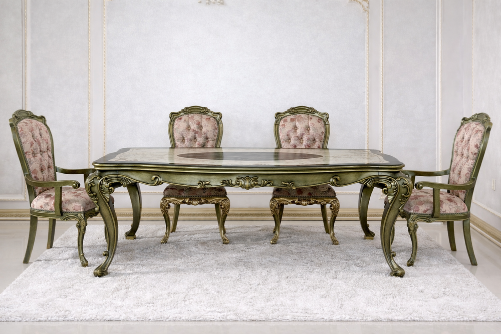 Bring refined European elegance to your dining space with this Luxury 4 Seater Dining Table Set, designed to offer a rich, royal appearance with timeless appeal. Expertly crafted in a classic European style, this dining set features heavy decorative hand-carved detailing, gracefully curved legs, and a premium antique green polish that highlights its superior craftsmanship and luxurious character.