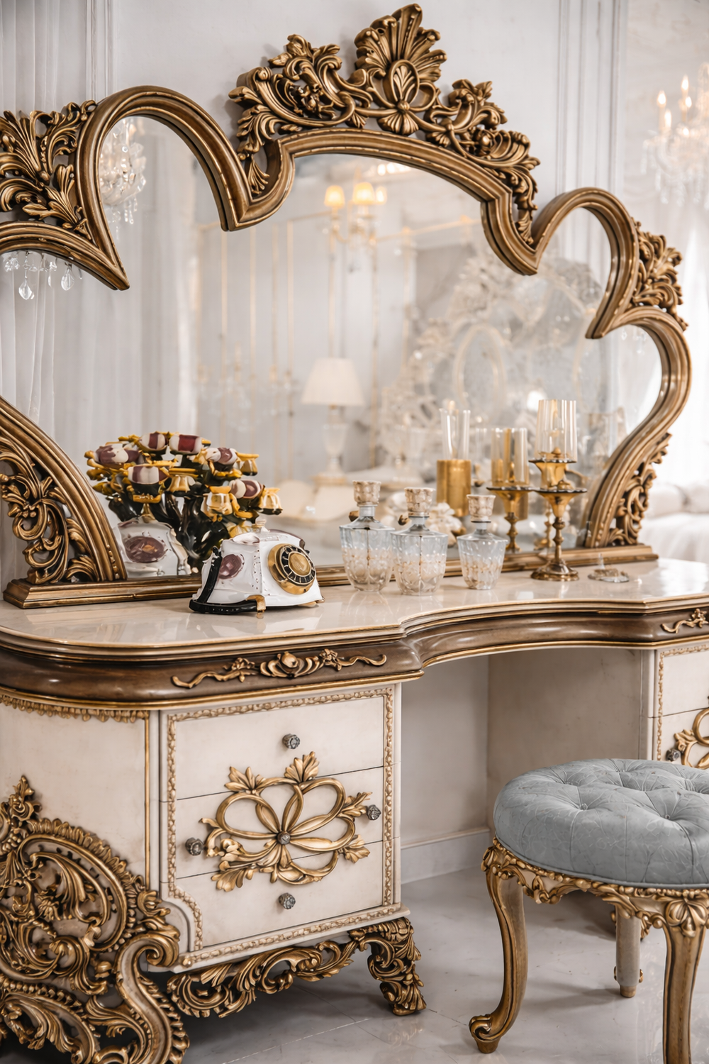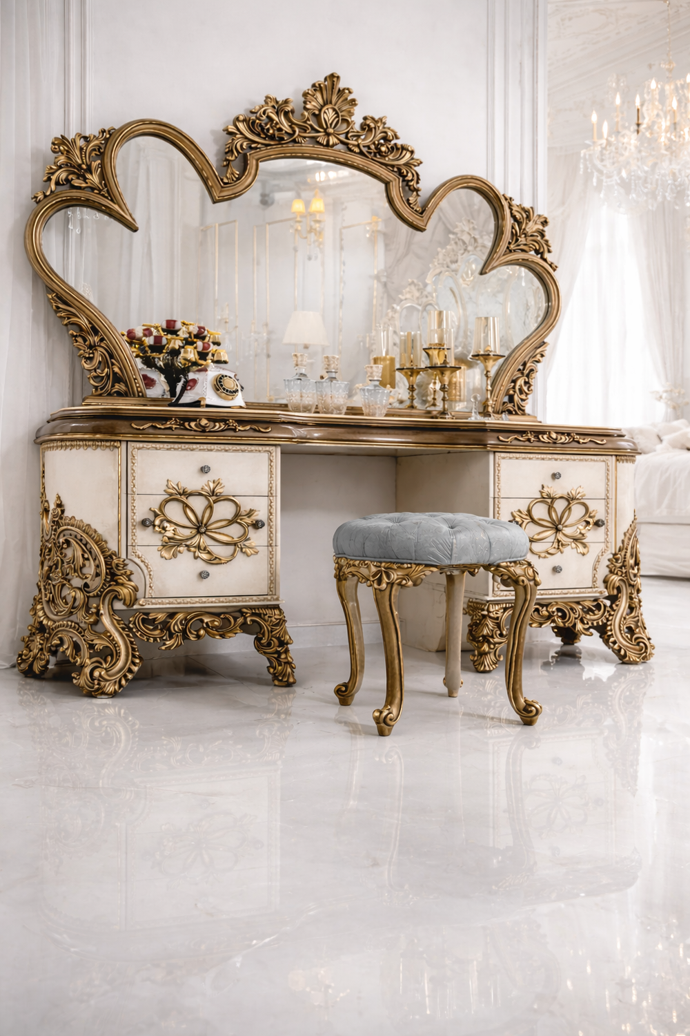 Experience timeless royal charm with this luxury antique dressing table, thoughtfully designed to combine classic elegance, superior craftsmanship, and enduring beauty. Adorned with intricate hand-carved detailing and finished in a rich blend of antique gold and ivory, this vanity table brings a majestic, palace-inspired presence to luxury bedroom interiors.