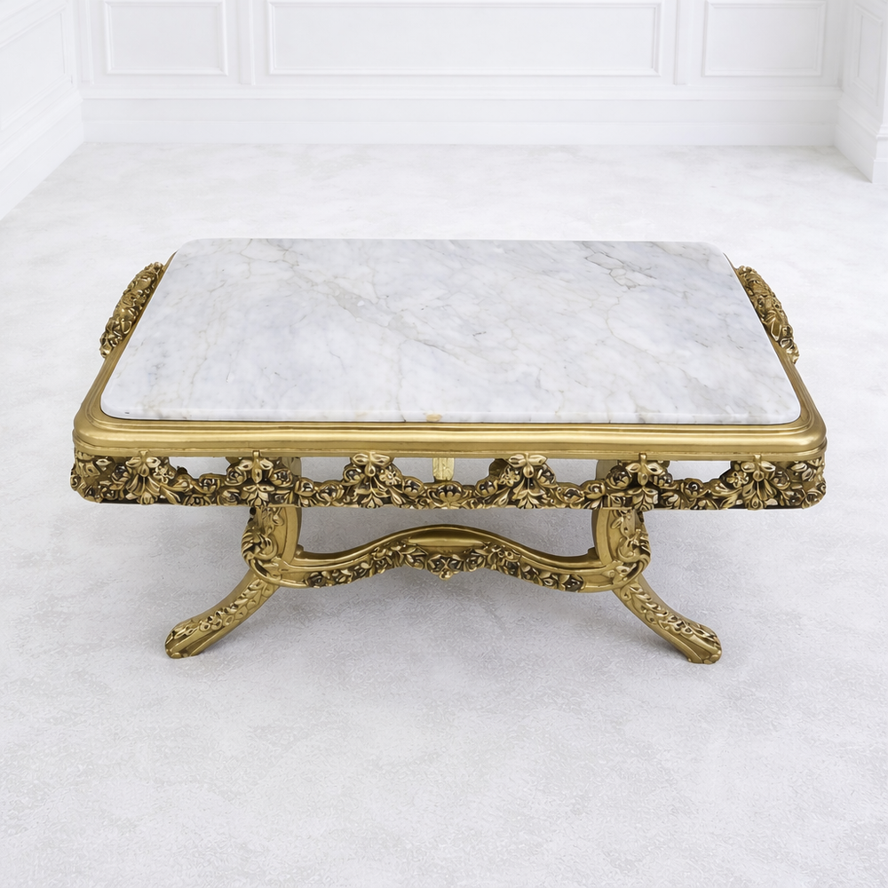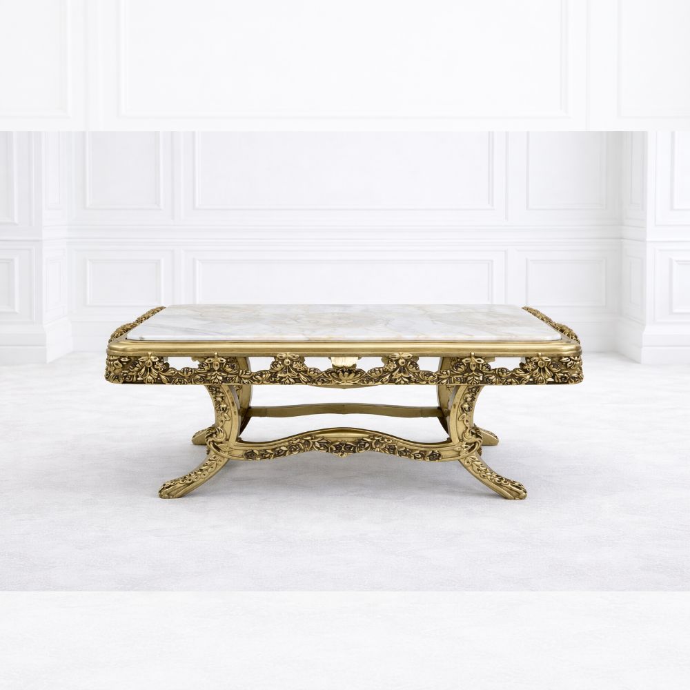 Add a touch of royal charm to your living space with this luxury antique gold carved center table, thoughtfully designed for premium interiors and upscale homes. This elegant designer piece showcases intricate hand-carved details finished in a rich antique gold tone, creating a regal and timeless aesthetic.
