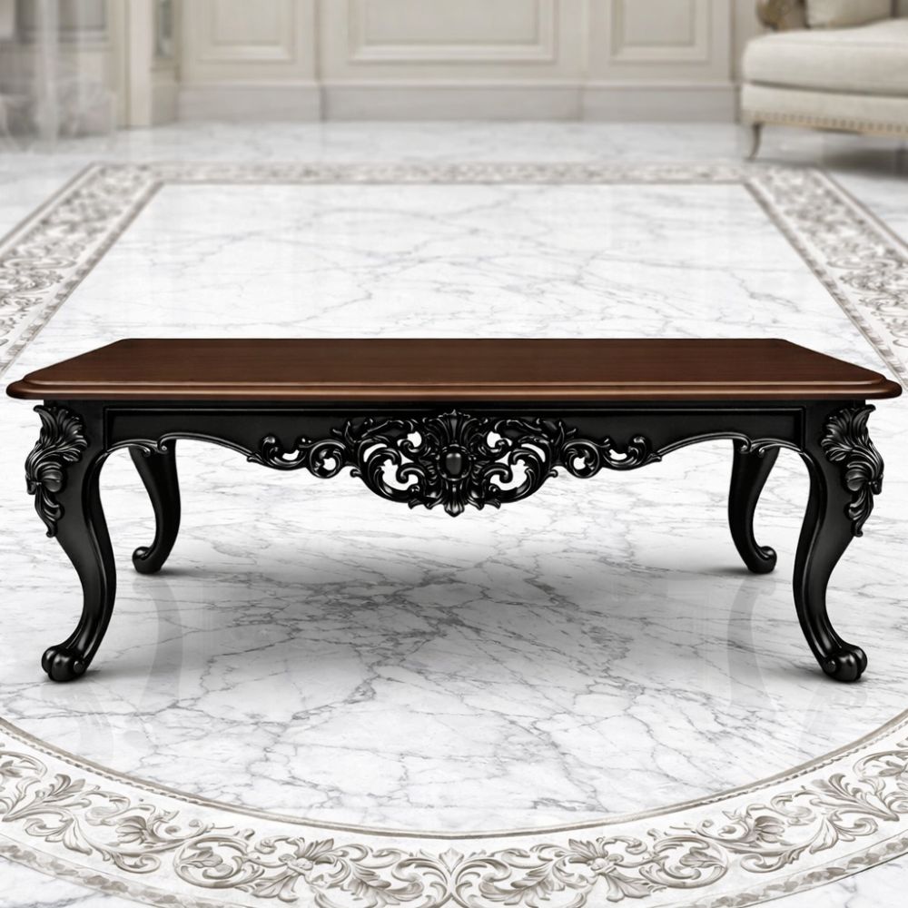Enhance your living space with this luxury black carved wooden center table, crafted to suit premium and royal interiors. This designer center table features a rich walnut wood finish tabletop paired with a deep black polished base, creating a striking contrast that exudes elegance and sophistication.