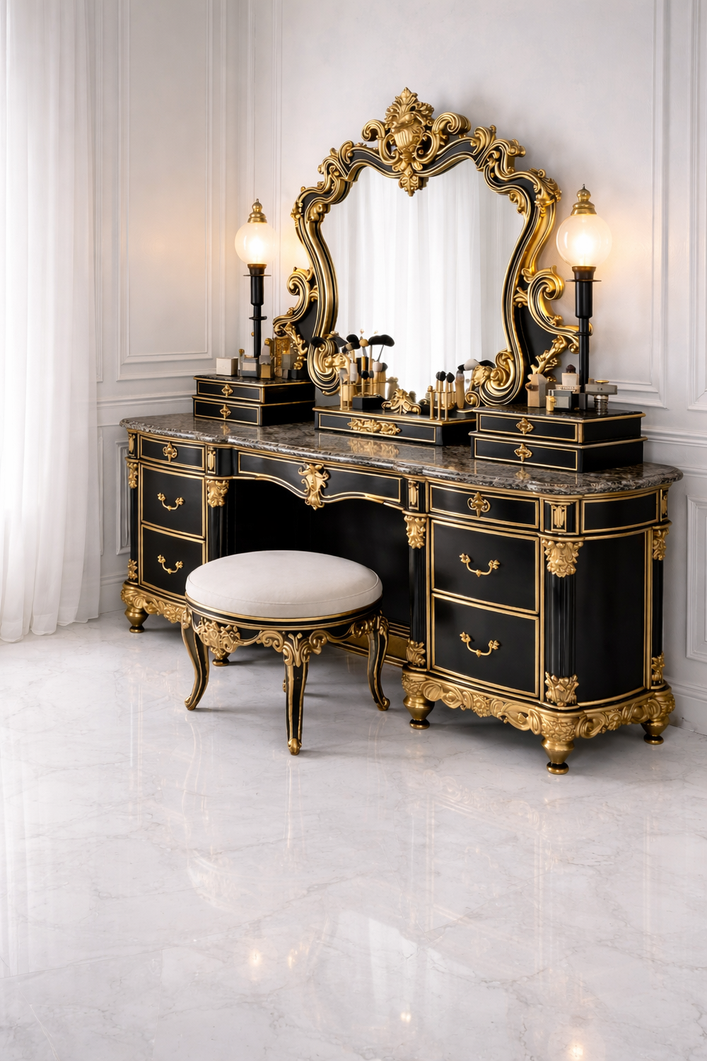 Perfect for customers seeking a luxury dressing table, black and gold vanity table, royal antique dressing table, or hand-carved wooden vanity, this exquisite piece stands out with its commanding design, premium finish, and refined detailing—making it a true centerpiece for high-end home interiors.