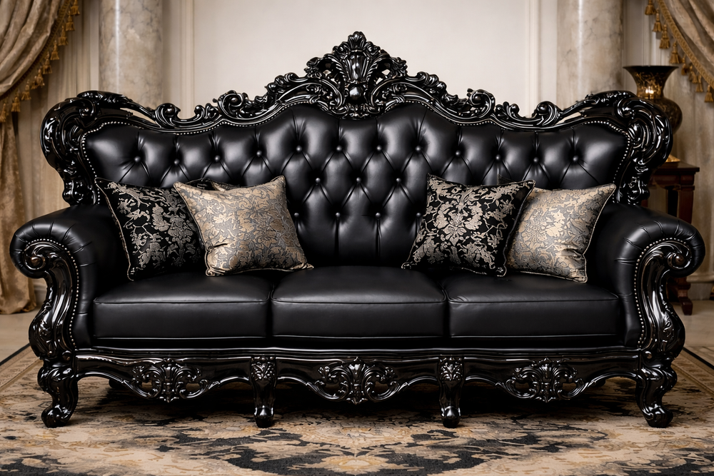 Enhance your living space with bold elegance and timeless sophistication through this Luxury Black Royal Sofa Set (3+1+1). Designed to make a striking statement, this sofa set is crafted from a premium solid wood frame and finished in a rich black polish, featuring intricate hand-carved detailing that reflects classic royal craftsmanship.