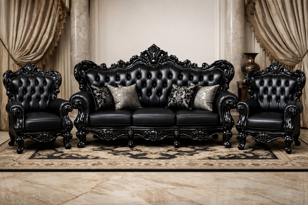 This set includes a 3-seater sofa with two matching single-seater chairs, perfectly suited for living rooms, drawing rooms, and luxury interiors. Blending traditional carving with modern elegance, this black royal sofa set is an ideal choice for those who appreciate premium furniture with lasting style.