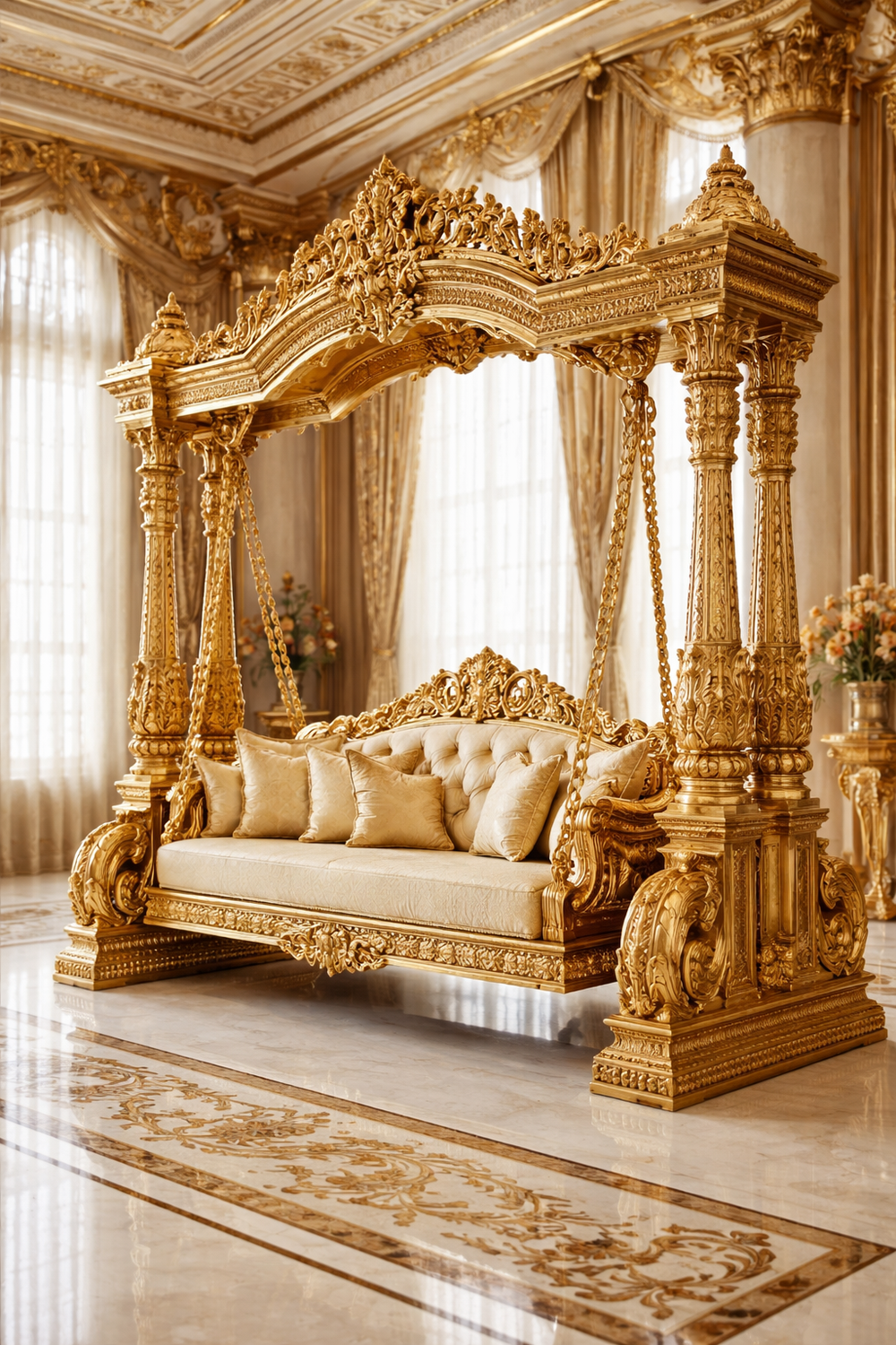 This royal golden swing jhula is more than just furniture—it is a symbol of luxury, heritage, and refined taste, crafted for those who desire high-end antique furniture and statement décor pieces that truly stand out.