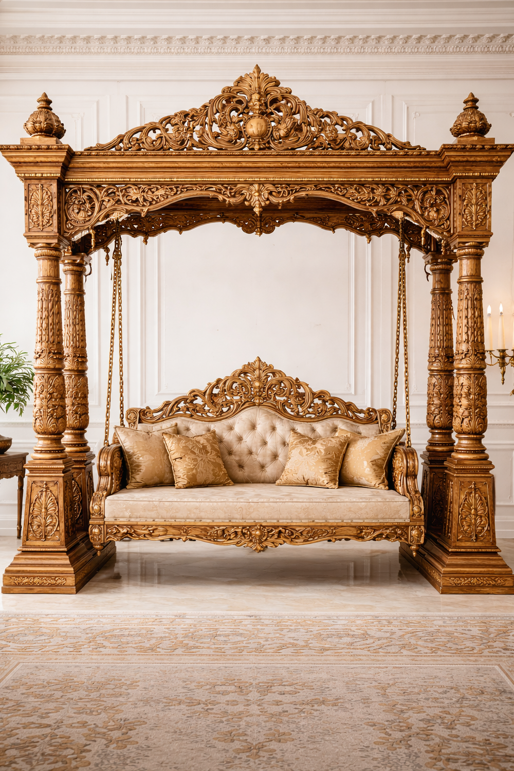 Bring timeless royalty into your home with this luxury hand-carved wooden jhula, crafted by skilled Indian artisans using premium quality solid wood. This royal carving design swing features intricate floral and traditional motifs, finished with a rich golden polish that enhances its majestic appeal.