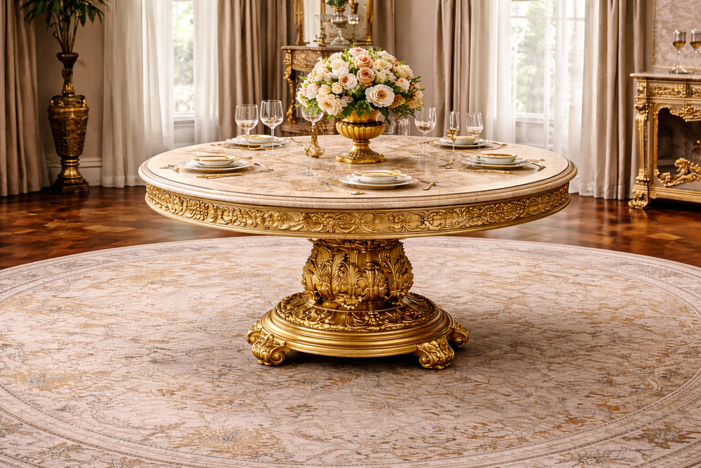 Perfect for luxury homes, villas, and classic dining interiors, this round 6 seater dining table set blends traditional craftsmanship with refined design. It serves as a stunning centerpiece that elevates your dining area with style, elegance, and exclusivity.