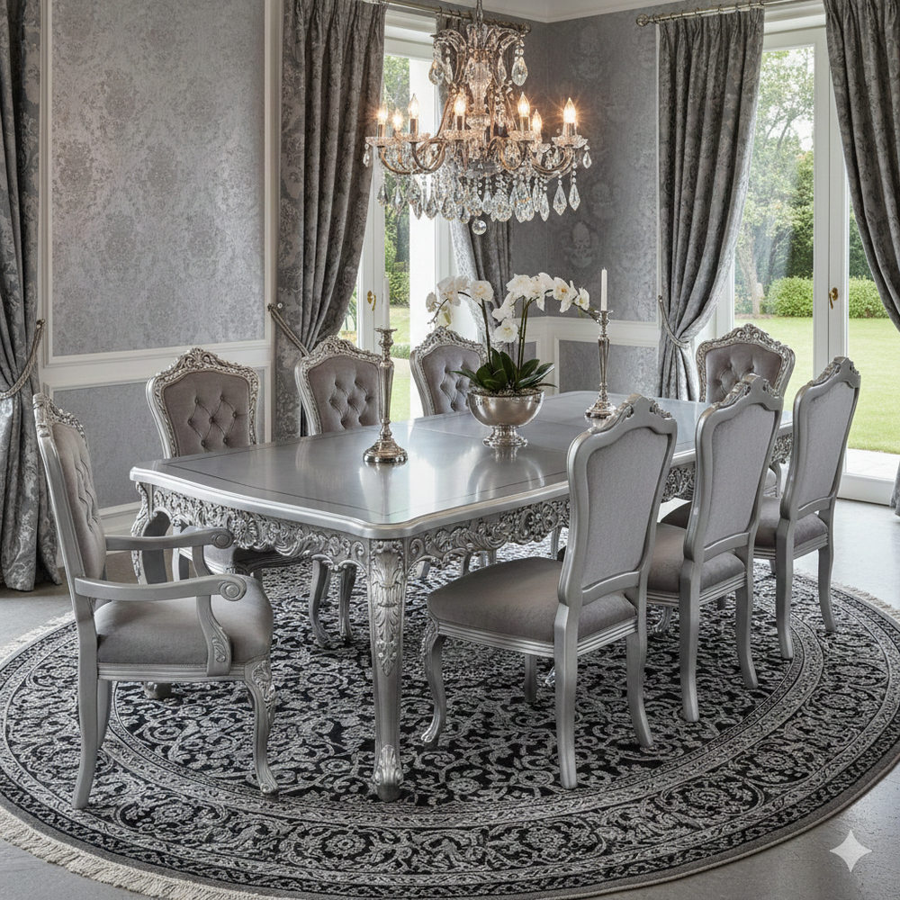Bring refined elegance and timeless royal charm to your dining space with this Luxury 8 Seater Dining Table Set, crafted to elevate premium and classic interiors. Made from high-quality solid wood, this exquisite dining set features intricate hand-carved detailing with a sophisticated silver-finished polish that reflects true European luxury and craftsmanship.