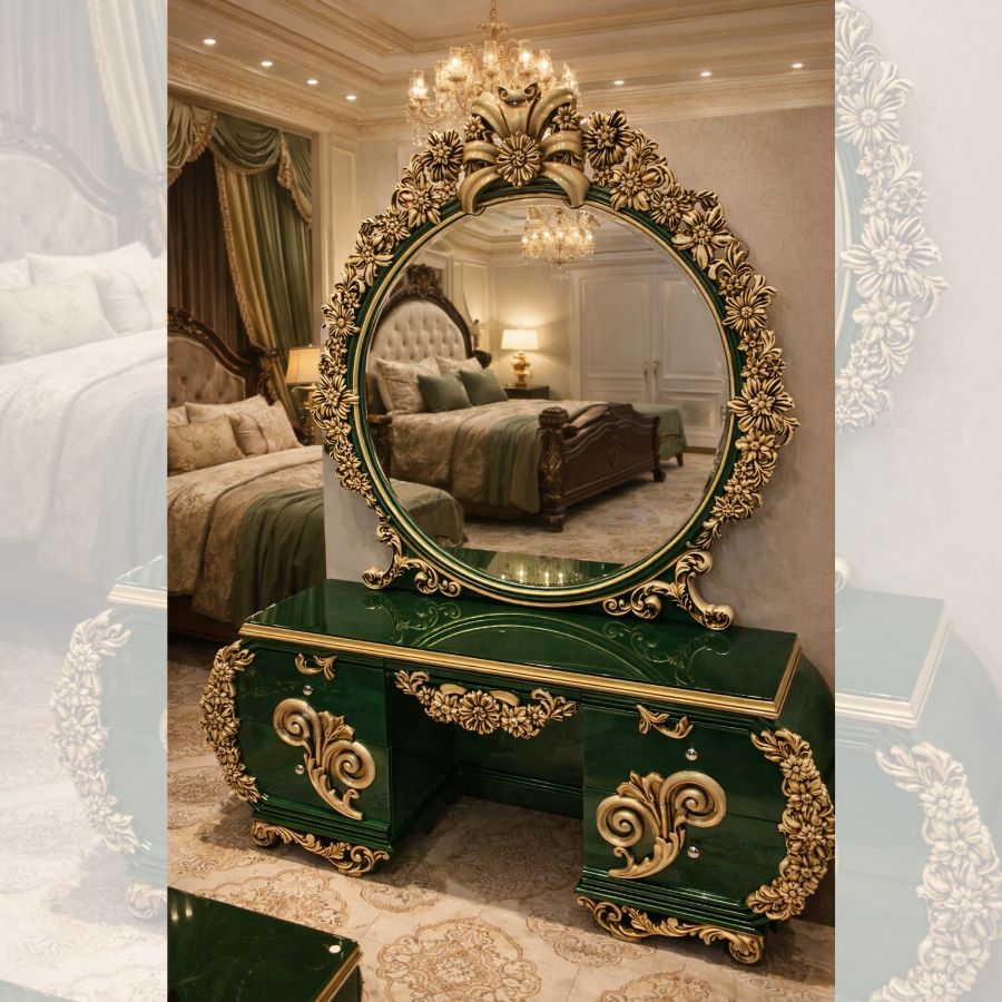 Bring royal elegance into your bedroom with this luxury green and gold dressing table, designed to make a bold statement of sophistication and craftsmanship. Featuring an exquisitely carved round mirror with floral detailing and a rich green polished finish accented with gold highlights, this piece reflects timeless luxury.